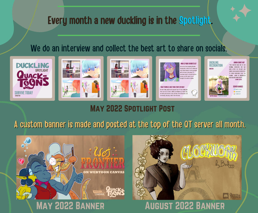 Quack Toons is a webcomic community hosting monthly spotlights and collaborations for creators from ALL publishing platforms. Join the discord server to become a duckling.