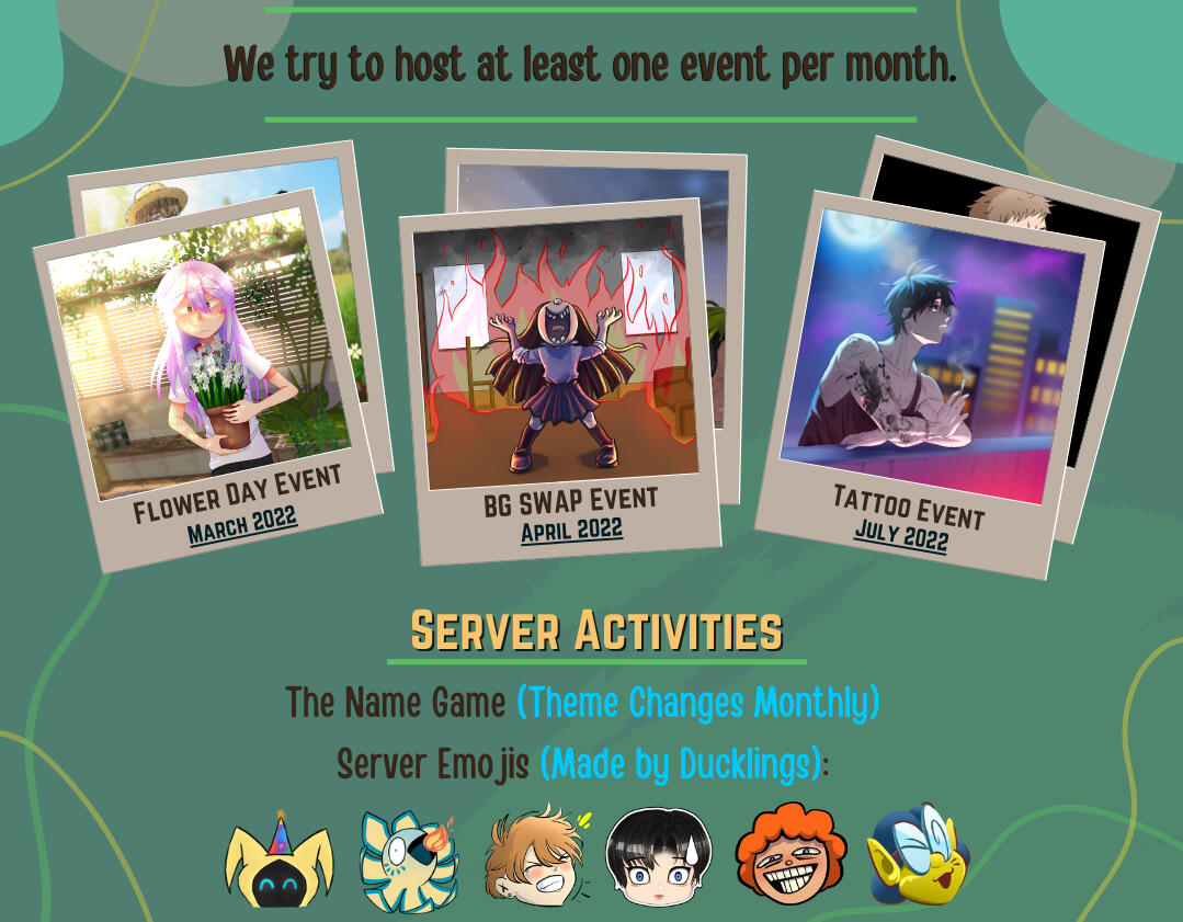 Each month we host an art prompt that all members of the Quack Toons discord can participate in. Entries to events are shared on Quack Toons social media to showcase the incredible talent of the ducklings in our community. Ducklings that complete events earn discord server badges that improve the chances of being featured in the monthly spotlight.